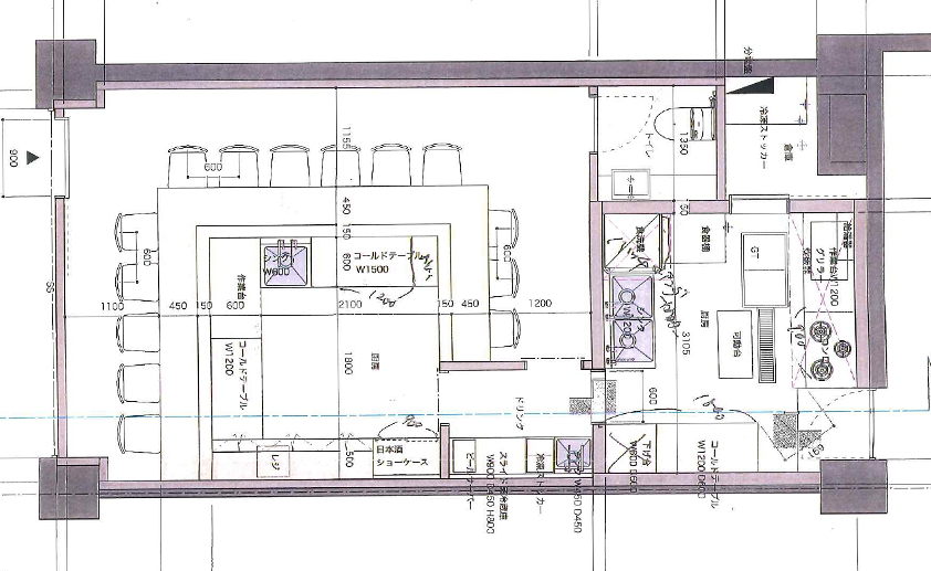 内装は既存を利用、新しく厨房機器を選定して設計して見積しました。食洗機、冷凍冷蔵庫、コールドテーブル、製氷機、冷蔵ショーケースなど合計で200万円位、リースも検討・見積提出(新品の場合)
